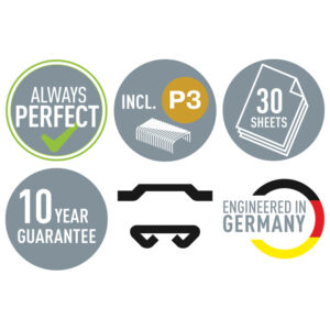stolni; spaja do 3 mm debljine ili 30 listova papira 80 g/m²; spajanje: otvoreno i zatvoreno klinasto; spajalice: 100 kom x br.24/6 ili 140 kom x br.26/6; garancija 10 godine